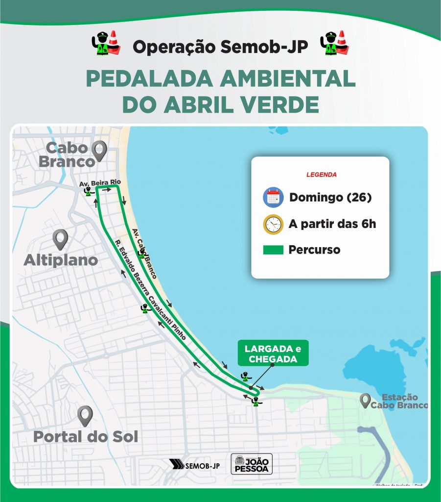 Pedalada Ambiental do Abril Verde – Também no domingo (26), partindo do Mirante do Cabo Branco, às 6h, os ciclistas seguirão pela Rua Edvaldo Bezerra Cavalcanti Pinho (Rua da Barreira) até a Avenida Ministro José Américo de Almeida, depois Avenida Cabo Branco, seguindo até o Mirante do Cabo Branco, para o encerramento do evento esportivo. A pedalada uma conscientização sobre segurança no trabalho (Abril Verde) com a sustentabilidade e promoção da saúde.